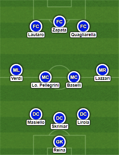 Un nome relativamente nuovo per difendere la porta della top 11: Pepe Reina al Milan è una riserva di lusso, di lui Gattuso può fidarsi ciecamente e possiamo farlo anche noi fantallenatori. La sfida in ottica Champions contro la Lazio promette scintille, ma i rossoneri devono dare segnali di risveglio per non compromettere quanto di buono è stato fatto sinora. Nei tre dietro, invece, scegliamo Pol Lirola (già 6 assist per lui, contro il Parma può incrementare il bottino), Milan Škriniar (stranamente ancora a secco in campionato, chissà che non riesca a sbloccarsi proprio a Frosinone) e Andrea Masiello (Tolói ai box, Palomino non al meglio, per lui si profila un’occasione ghiotta per giocare titolare). In mezzo al campo puntiamo tutto su Manuel Lazzari (torna dopo un turno di squalifica e sfida una Juve distratta dalla Champions e a ranghi ridotti), Daniele Baselli (Toro privo di Belotti e Iago Falque, allora toccherà all’ex Atalanta dar manforte davanti con i suoi inserimenti), Lorenzo Pellegrini (sulla trequarti giallorossa con licenza di inventare e provare a colpire: scommettiamo su di lui e sulla sua fame dopo un lungo stop) e Simone Verdi (fuori in EL, prevediamo una maglia da titolare al Bentegodi). Infine, l’attacco delle meraviglie: a Fabio Quagliarella non mancheranno certo le motivazioni nel derby contro il Genoa e dovrà guardarsi le spalle anche in classifica marcatori, dove è tallonato da un altro giocatore sul quale puntiamo questa settimana, Duván Zapata (rientra tirato a lucido dopo un turno di squalifica); tridente completato dal recuperato Lautaro Martínez, che punta a riconquistare un posto da titolare ai danni del connazionale Icardi.