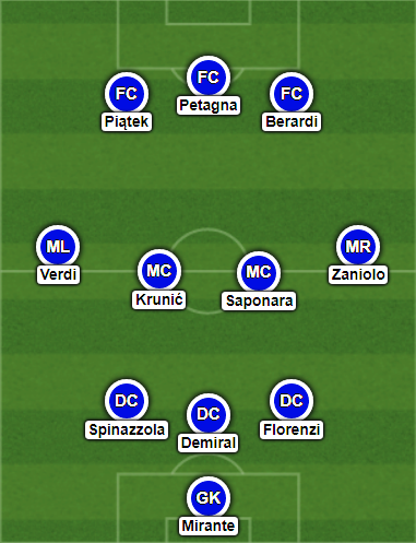 A difesa dei pali della top 11 di giornata troviamo il portiere giallorosso Antonio Mirante, che rispetto a Olsen sta dando maggiore sicurezza al reparto romanista (ha subito solo un gol nelle ultime 4 gare disputate). Terzetto difensivo composto da un altro giallorosso come Florenzi (grande prestazione contro il Cagliari, sta bene fisicamente e va schierato), dal neroverde Demiral (sempre pungente su palla inattiva, chissà che al Mapei Stadium contro un Frosinone rassegnato non trovi un bel +3) e dal bianconero Spinazzola (chance dall’inizio per l’azzurro nel derby della Mole a causa del forfait di Alex Sandro). In mediana, invece, puntiamo come sempre su quattro nomi in odore di bonus: Zaniolo rientra dalla squalifica e merita la nostra fiducia, Saponara giocherà titolare a Parma al posto del compagno Gastón Ramírez, che è stato fermato dal Giudice Sportivo, Krunić fra i centrocampisti empolesi è l’unico che può dar manforte all’attacco in termini realizzativi, e Verdi, che potrebbe strappare una maglia da titolare al San Paolo contro il Cagliari. Per finire, un tridente con buone possibilità di trovare la via del gol: Berardi è in gran forma (3 centri nelle ultime 5 giocate) e in casa contro il Frosinone non può non essere schierato, Petagna al Bentegodi cercherà di rimpinguare ulteriormente il proprio bottino di reti, infine Piątek, chiamato a dare una scossa a un Milan che sembra aver tirato i remi in barca.