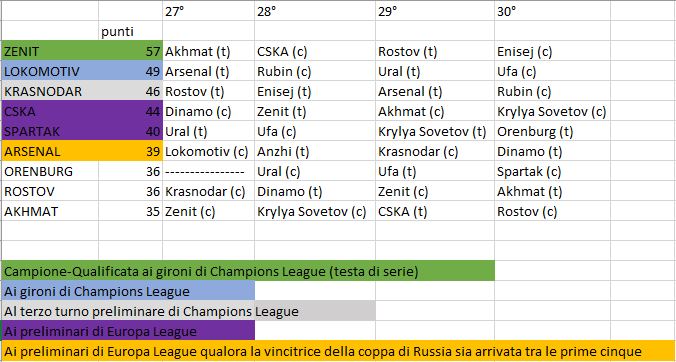 Vediamo nel dettaglio la volata conclusiva per quanto riguarda la parte alta della classifica. Ancora da sciogliere la questione della coppa di Russia, con le semifinali di ritorno in programma il 15 maggio. Il Rostov ospita la Lokomotiv dopo il 2-2 di Mosca, l’Arsenal è chiamato alla rimonta contro l’Ural (1-0 a Ekaterinburg).