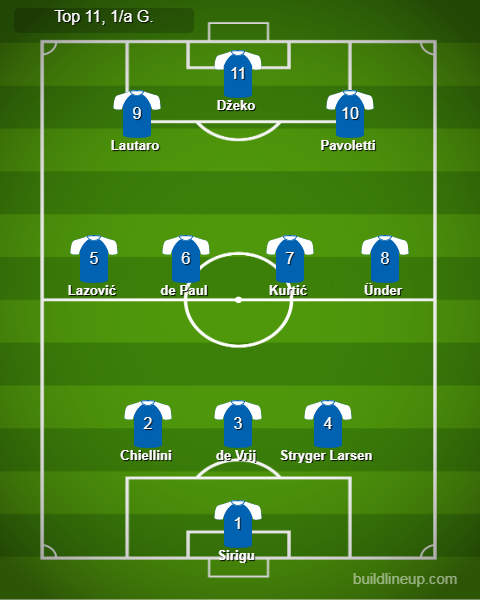 LA TOP 11 (3-4-3) – Sirigu (Torino); Stryger Larsen (Udinese), de Vrij (Inter), Chiellini (Juventus); Ünder (Roma), Kurtić (SPAL), de Paul (Udinese), Lazović (Hellas Verona); Pavoletti (Cagliari), Džeko (Roma), Lautaro Martínez (Inter).