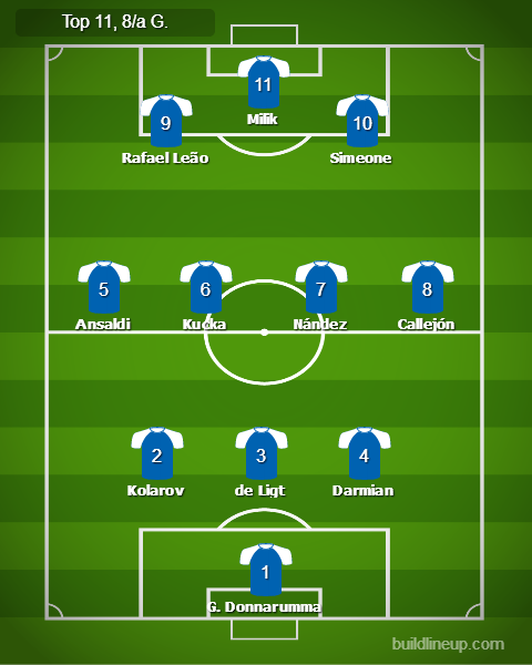 LA TOP 11 (3-4-3) – G. Donnarumma (Milan); Darmian (Parma), de Ligt (Juventus), Kolarov (Roma); Callejón (Napoli), Nández (Cagliari), Kucka (Parma), Ansaldi (Torino); Simeone (Cagliari), Milik (Napoli); Rafael Leão (Milan).