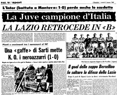 Contemporaneamente a Roma la Juventus batte 2-1 la Lazio, condannandola alla retrocessione in B, grazie ai gol di Bercellino e Zigoni (ininfluente il rigore del debuttante laziale Di Pucchio). La Juventus conquista quindi il suo 13° scudetto, nel modo più rocambolesco e inatteso. Lo stesso Gianfranco Zigoni dichiarerà nel 2008: “Lo scudetto del ’67, quello conquistato all’ultima giornata, è merito di Heriberto Herrera. Noi calciatori avevamo già mollato, lui no. L’Inter tecnicamente era superiore, la Juve una squadra operaia. Però abbiamo vinto e ce lo siamo anche meritato“. L’Inter finì di sprofondare il 6 giugno, perdendo l’accesso alla finale di Coppa Italia per mano del Padova militante in B.