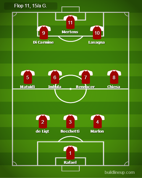 LA FLOP 11 (3-4-3) – Rafael (Cagliari); Marlon (Sassuolo), Bocchetti (Hellas Verona), de Ligt (Juventus); Chiesa (Fiorentina), Bennacer (Milan), Imbula (Lecce), Matuidi (Juventus); Lasagna (Udinese), Mertens (Napoli), Di Carmine (Hellas Verona).