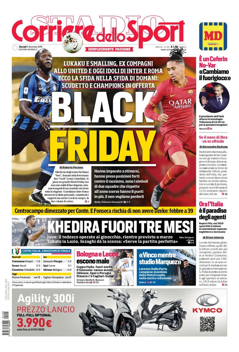 Quel Black Friday è solo un titolo, signori. Particolare, sicuramente; razzista? no. Non ci vediamo nulla di razzista né di offensivo, neanche volendo pensare al senso stesso del Black Friday vero, quello degli sconti, eccetera: son discorsi esagerati, sarebbe voler trovare per forza un capo d’accusa molto al di qua dell’ogni ragionevole dubbio. Il buonismo di oggi: prima ne facciamo a meno, meglio sarà. Fateci caso: la società moderna sente il bisogno di indignarsi. E schierarsi. La società moderna non legge tra le righe, non scruta, non osserva, “guarda ma non vede”. Legge Black Friday quando NON è il Black Friday, nota Lukaku e Smalling in prima pagina, intuisce la sfumatura appena necessaria a sbloccare il telefonino, e via con la caccia alle streghe. Ma in quel titolo, esattamente come spiegato nell’articolo annesso a firma di Roberto Perrone (che, a suo modo, sa di doverosa excusatio non petita messa lì, a prescindere, perché – come detto – magari lo temevano pure ‘sto polverone), di razzista non c’è proprio niente. E non c’è niente neanche di accusatorio. Nulla, zero: Lukaku e Smalling sono “black”, vero. E allora? Dov’è l’insulto? Sono meravigliosamente neri. A Wonderful Black Friday, ecco: CorSport, dovevi titolare così. Un aggettivo come parafulmine, contro il falso-moralismo.