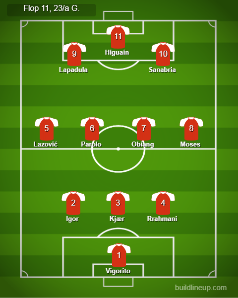 LA FLOP 11 (3-4-3) – Vigorito (Lecce); Rrahmani (Hellas Verona), Kjær (Milan), Igor (Fiorentina); Moses (Inter), Obiang (Sassuolo), Parolo (Lazio), Lazović (Hellas Verona); Sanabria (Genoa), Higuaín (Juventus), Lapadula (Lecce).
