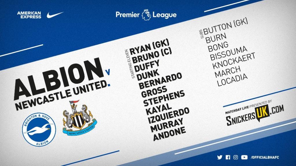 BRIGHTON: Ryan; Bruno, Duffy, Dunk, Bernardo; Stephens, Kayal; Izquierdo, Gross; Andone, Murray.