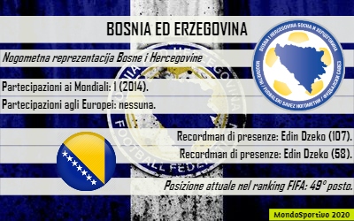 I CONVOCATI. Portieri: Asmir Begovic (33 anni, Bournemouth – ING), Ibrahim Sehic (31 anni, Konyaspor – TUR), Jasmin Buric (33 anni, Hapoel Haifa – ISR). Difensori: Toni Sunjic (31 anni, Dynamo Mosca – RUS), Ermin Bicakcic (30 anni, Hoffenheim – GER), Sead Kolasinac (27 anni, Arsenal – ING), Eldar Civic (24 anni, Ferencvaros – UNG), Zoran Kvrzic (32 anni, Kayserispor – TUR), Adnan Kovacevic (26 anni, Ferencvaros – UNG), Branimir Cipetic (25 anni, Siroki Brijeg), Sinisa Sanicanin (25 anni, Vojvodina – SER). Centrocampisti: Edin Visca (30 anni, Istanbul Basaksehir – TUR), Muhamed Besic (27 anni, Everton – ING), Haris Duljevic (26 anni, Nimes – FRA), Gojko Cimirot (27 anni, Standard Liegi – BEL), Amer Gojak (23 anni, Dinamo Zagabria – CRO), Deni Milosevic (25 anni, Konyaspor – TUR), Luka Menalo (24 anni, Dinamo Zagabria – CRO), Haris Hajradinovic (26 anni, Kasimpasa – TUR), Amir Hadziahmetovic (23 anni, Konyaspor – TUR), Anel Sabanadzovic (21 anni, AEK Atene – GRE), Vladan Danilovic (21 anni, Borac Banja Luka). Attaccanti: Edin Dzeko (34 anni, Roma – ITA), Armin Hodzic (25 anni, Fehervar – UNG), Elvir Koljic (25 anni, Universitatea Craiova – ROM).