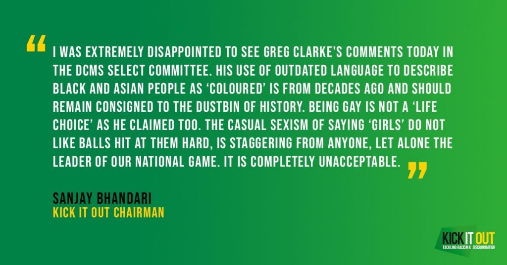 Il dibattito sulla figura di Clarke è esploso improvvisamente nel corso di un incontro con il Digital, Culture, Media and Sport Committee quando, al momento del dibattito sulle difficoltà dei giocatori omosessuali nel fare coming-out a causa delle possibili ripercussioni sui social media, ha risposto: “Se vedete che cosa succede alle calciatrici femminili di alto livello, i calciatori di colore di alto livello e gli abusi che subiscono sui social media… i social media sono un tutti contro tutti”. Ad aver scatenato le polemiche è stato il termine “coloured footballers”, subito notato dal parlamentare e membro del Comitato Kevin Brennan, che ha chiesto a Clarke di ritirare l’uso della parola “coloured”.