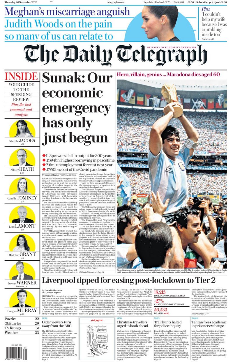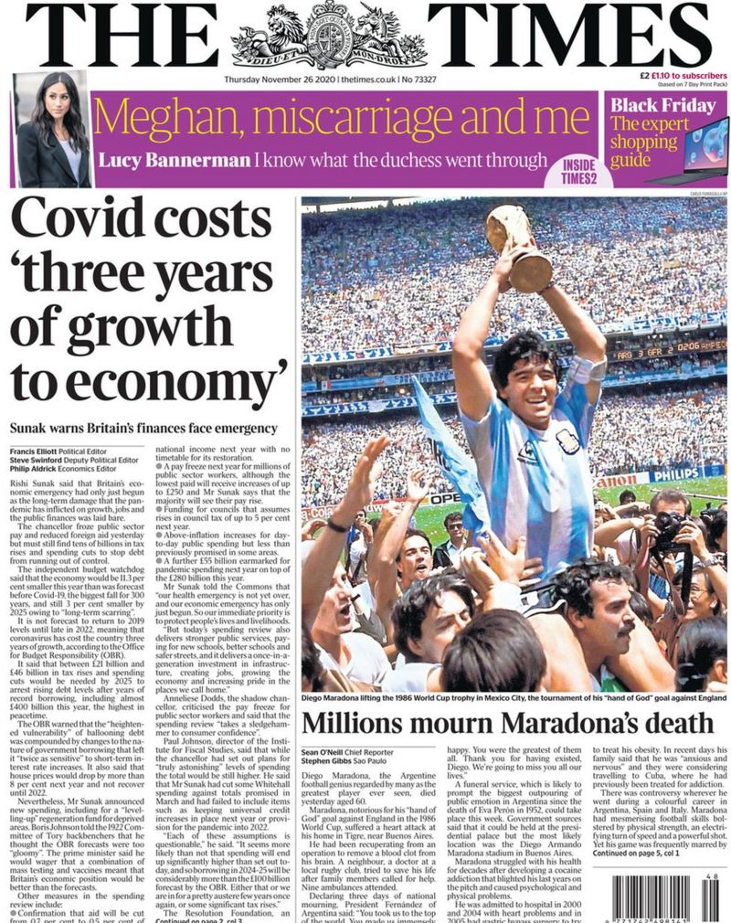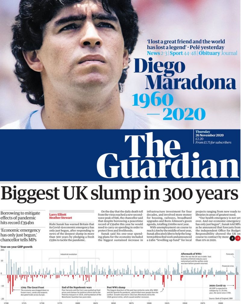 Diversi, invece, i toni usati da Daily Telegraph (una foto di Maradona sostenuto dai tifosi dell’Argentina e con la Coppa del Mondo in mano, accompagnato da un “Hero, villain and genius”) e Guardian (che propone le parole di Pelé).