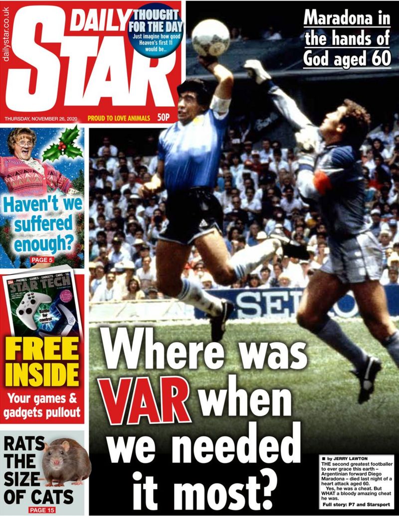 Sono ben quattro i giornali ad aver scelto come immagine principale la “mano de Dios” del campione argentino, indicandola come momento iconico della sua vita: Sun, Daily Mirror, Daily Express e Daily Star. I primi tre hanno scelto di giocare sull'”In the hands of God”, per poi affidarsi alle bell’omaggio di Gary Lineker, avversario di Maradona proprio in quella partita; decisamente più polemico, anche in maniera inopportuna, l’ultimo, che ha intitolato con un “Where was VAR when we needed it most?” (Dov’era il VAR quando ne avremmo avuto più bisogno?), accompagnato dal commento di Jerry Lawton che esordisce con un “The Second greatest footballer to ever Grace this heart”.