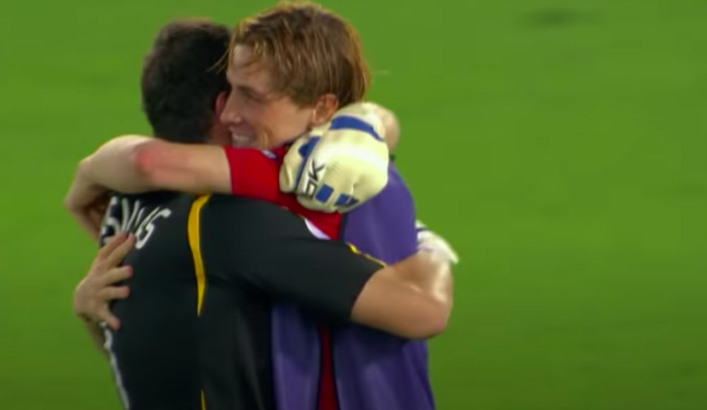 La Germania parte forte, Ballack non è solo ristabilito, ma proprio in palla e il suo dribbling a Puyol lo dimostra. Lehmann, però, deve fare il gatto per salvare una pericolosa deviazione sotto misura di Metzelder su iniziativa di Iniesta. L’equilibrio dimostra la forza delle due compagini. Il colpo di testa sul palo di Fernando Torres al 22’ è il segnale che le Furie Rosse stanno aumentando i giri, pericolo imminente. E, infatti, al 33’ la finale si sblocca: l’asse in verticale Capdevila-Senna-Fabregas-Torres scorre come una biro su un foglio di carta. El Niño supera in velocità e in forza Lahm, anticipa l’uscita al limite dell’area di Lehmann con un guizzo che manda la palla morbida in rete, gol della Spagna di una bellezza unica! Una rivincita per il rubio attaccante iberico, fin lì soltanto comparsa del torneo e a segno un’unica volta, contro la Svezia. Si val riposo sullo 0-1, nella ripresa tocca alla Germania riannodare i fili di un destino che si è spezzato. Tocca al leader Ballack, ma il suo tiro sulla volèe di Schweinsteiger sfiora soltanto il palo alla destra di Casillas. È la Spagna, però, a creare le occasioni migliori in contropiede e, su una punizione di Xavi, Lehmann deve intervenire con i guantoni per evitare il raddoppio su colpo di testa di Sergio Ramos, uno che con il gol ha un grande feeling, nonostante sia un difensore. La storia futura della Champions (2014, ndr) parlerà per lui. Ancora Frings, sul corner seguente, si oppone sulla linea a Iniesta, già sicuro di festeggiare il gol. Nominare attaccanti tedeschi è difficile, perché la squadra è sulle gambe e non riesce a produrre offensive di rilievo.