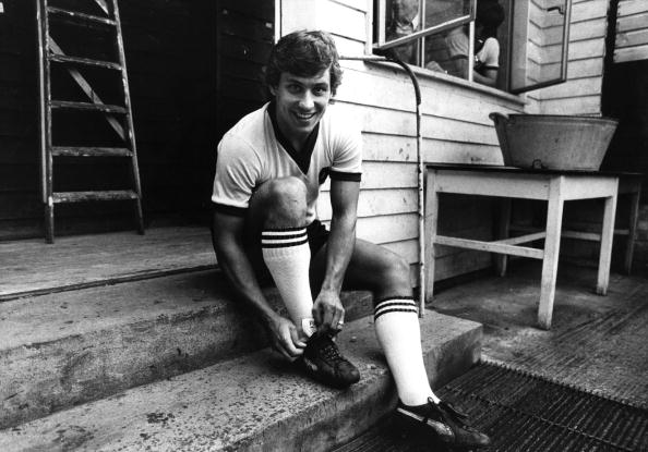 25th July 1980: Kenny Sansom, who played for Crystal Palace and Arsenal FC, ties his shoe-laces in preparation for a match. (Photo by Evening Standard/Getty Images)