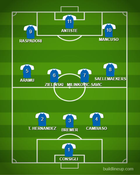 LA TOP 11 (3-4-3) – Consigli (Sassuolo); Cambiaso (Genoa), Bremer (Torino), T. Hernandez (Milan); Aramu (Venezia), Milinkovic-Savic (Lazio), Zielinski (Napoli), Saelemaekers (Milan); Mancuso (Empoli), Raspadori (Sassuolo), Antiste (Spezia).
