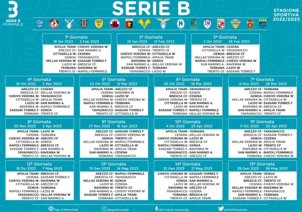 La Divisione Calcio Femminile ha presentato sui propri account social il calendario della prima fase della Serie B Femminile 2022-2023. La nuova stagione prenderà il via domenica 18 settembre con sedici squadre ai nastri di partenza e si concluderà il 28 maggio 2023.
