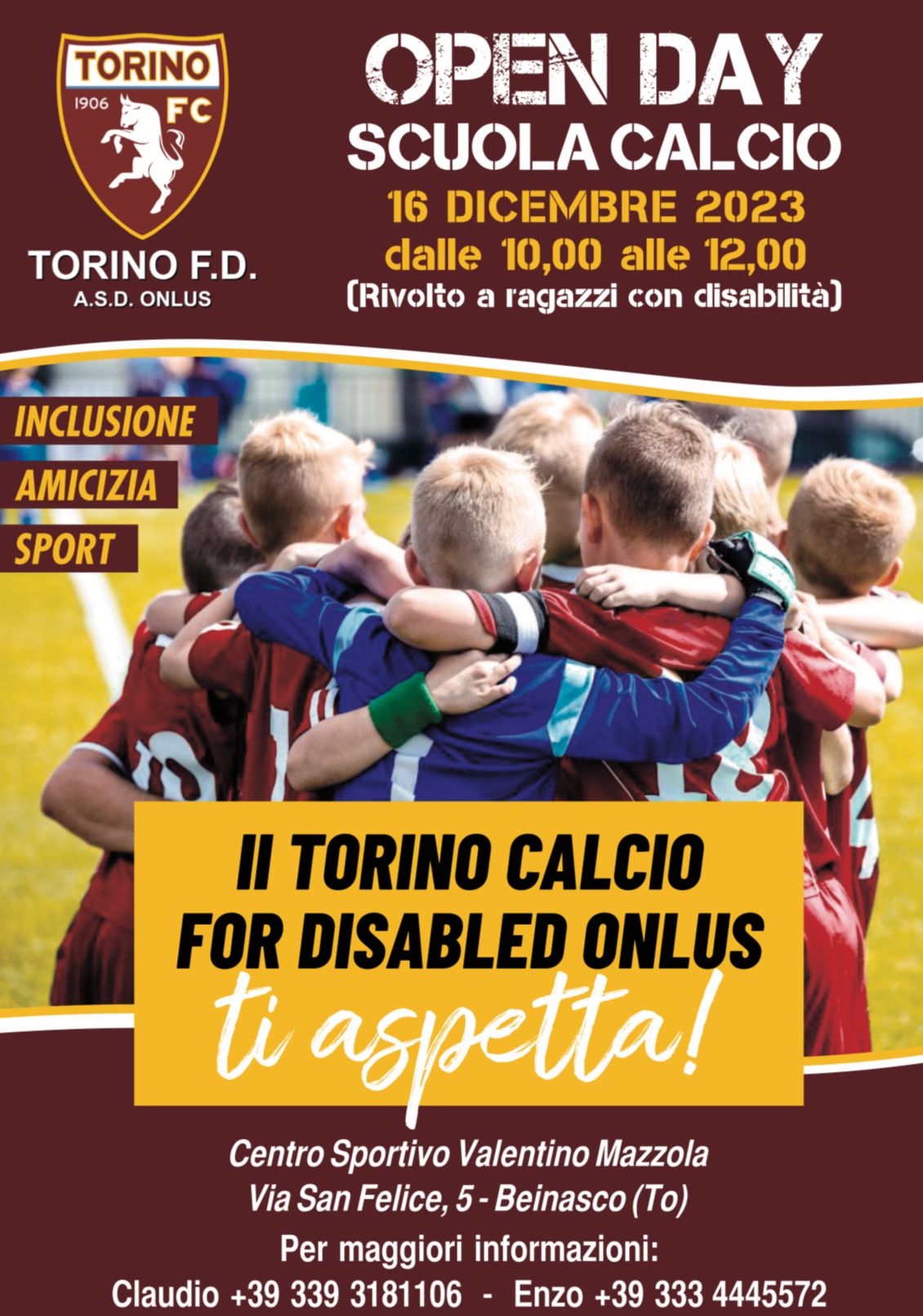 Lo sport per superare isolamento e difficoltà, come strumento di integrazione: al via la scuola calcio del Torino For Disabled Onlus, progetto nato per coinvolgere bambini che soffrono di disabilità intellettive e/o disabilità motorie di livello medio,