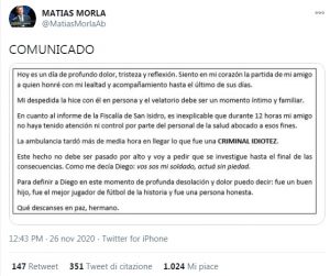 Cominciano i primi strascichi polemici sulla morte di Diego Armando Maradona. Matias Morla, legale e amico del Pibe de Oro,...